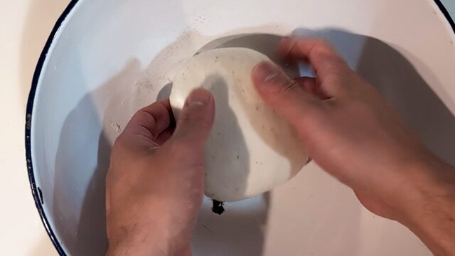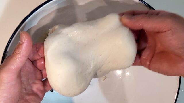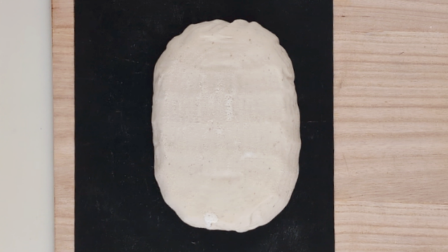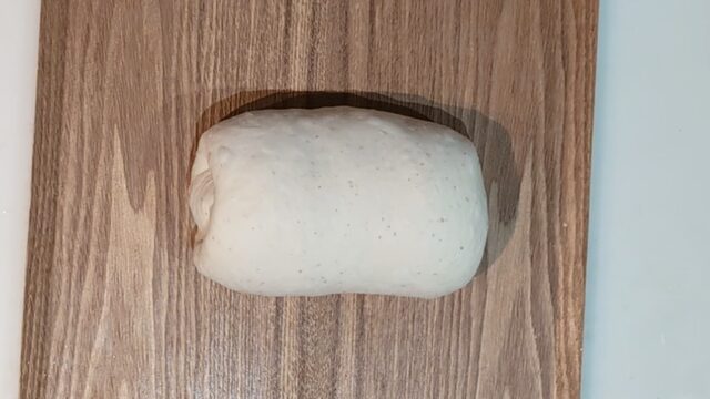 - 生地を成形します。生地に溜まったガスを抜いて折りたたみ、楕円形に整えます。
