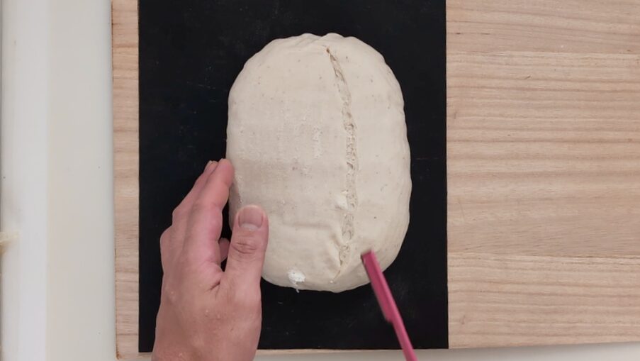 - クープナイフ(もしくはナイフやカミソリ)でパンの中心を端から端までカットします。