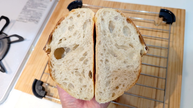 焼き上がったパンのクラスト(外皮)はとても香ばしく、クラム(中身)はしっとりとしてつやがあり、大小の気泡が入ったソフトな食感に仕上がりました。