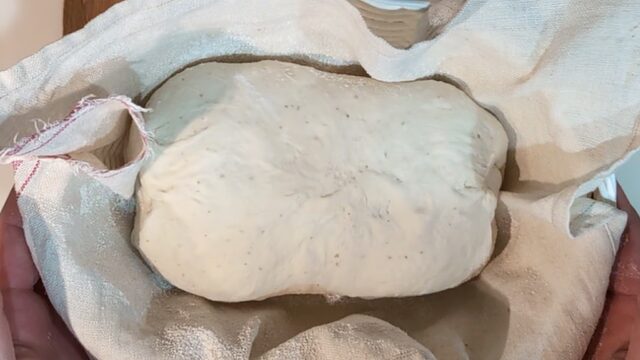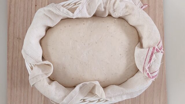 - 発酵かごに薄手の布を敷き、粉を振りかけます。閉じ目を上にして発酵かごに入れ、ビニール袋に入れます(乾燥防止)。