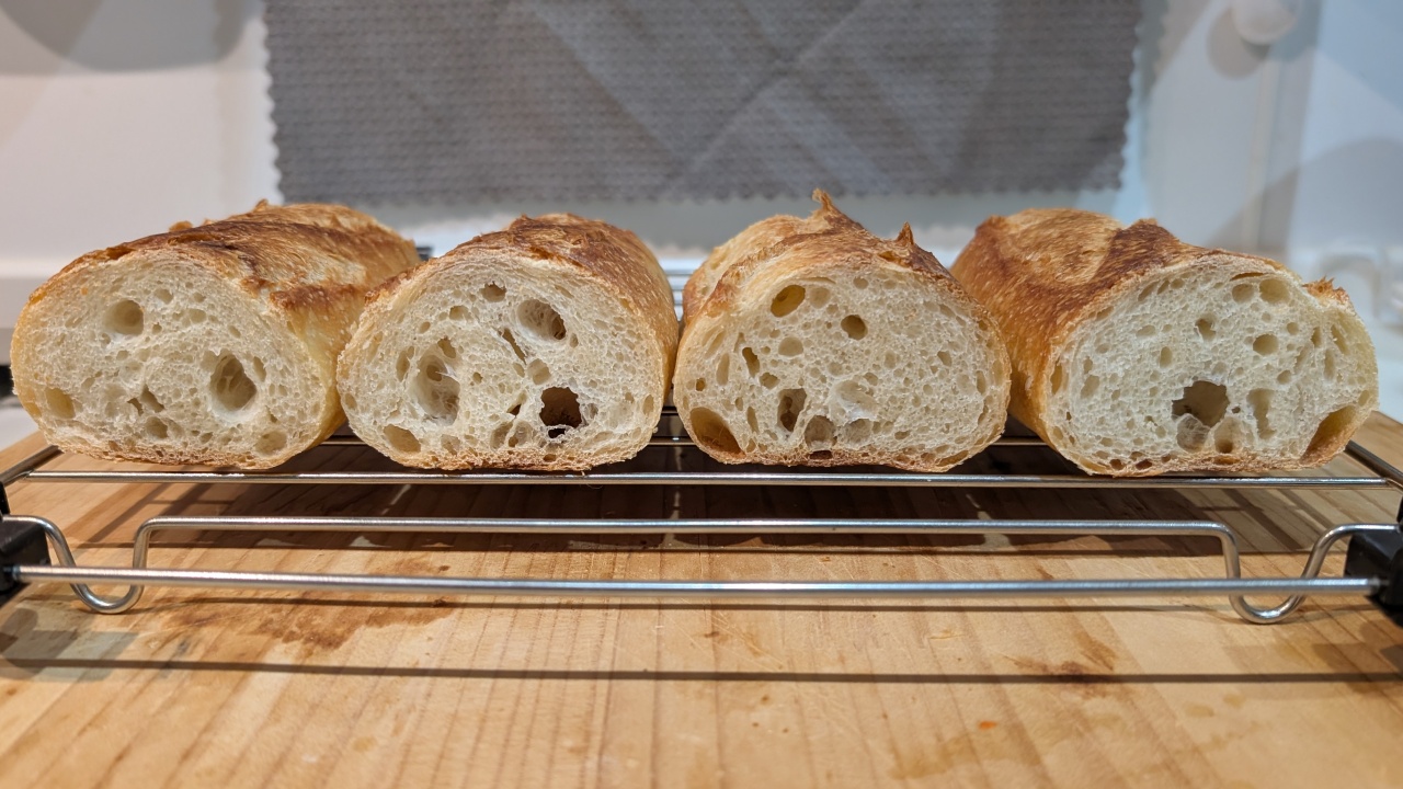 オーバーナイト法で作ったバゲットはストレート法で作ったものと比べて香りや風味、旨味が強くなります。個人的にはとてもおいしいパンだと思います。