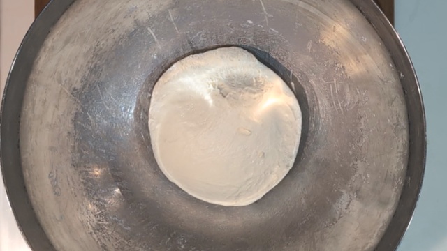 - 成形します。生地のガスをやさしく抜いてきれいな面を下にし、上下の端を中心に向けて折りたたんで生地を張らせます。更に生地を張らせるように折りたたみ、細長く伸ばします。