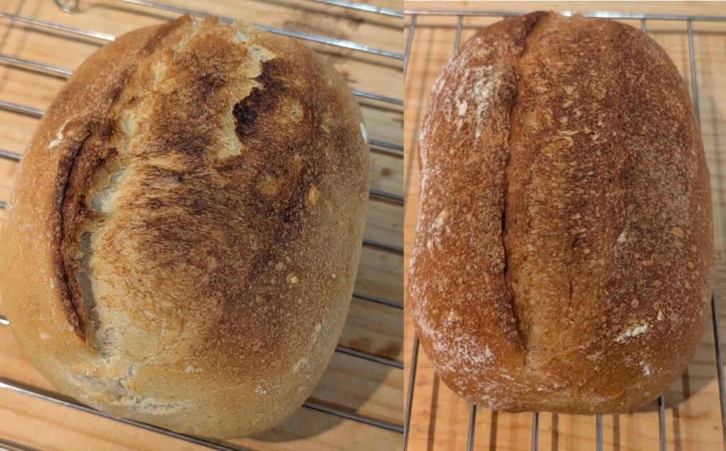 左は小麦粉100%のパン、右が米粉配合カンパーニュです。焼き時間は左の方が5分長いのに、焼き色は右の方が濃いですよね。