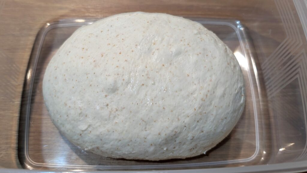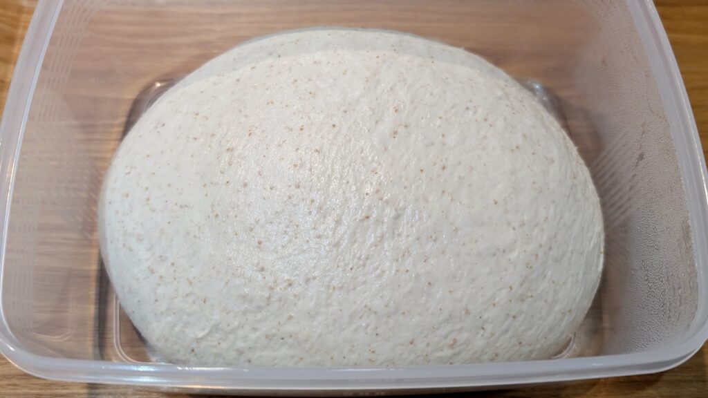 普通、一次発酵が終わると生地の力が抜けてダラッとした感じになりますが、まだプリッとした状態を保っています。見るからに硬い生地です。