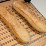 - 板に乗せてベーキングシートごと滑らせるようにオーブン(250℃に予熱済み)に入れ、すぐにスチームを入れます。5分焼いたら230℃に落として約38分焼きます。