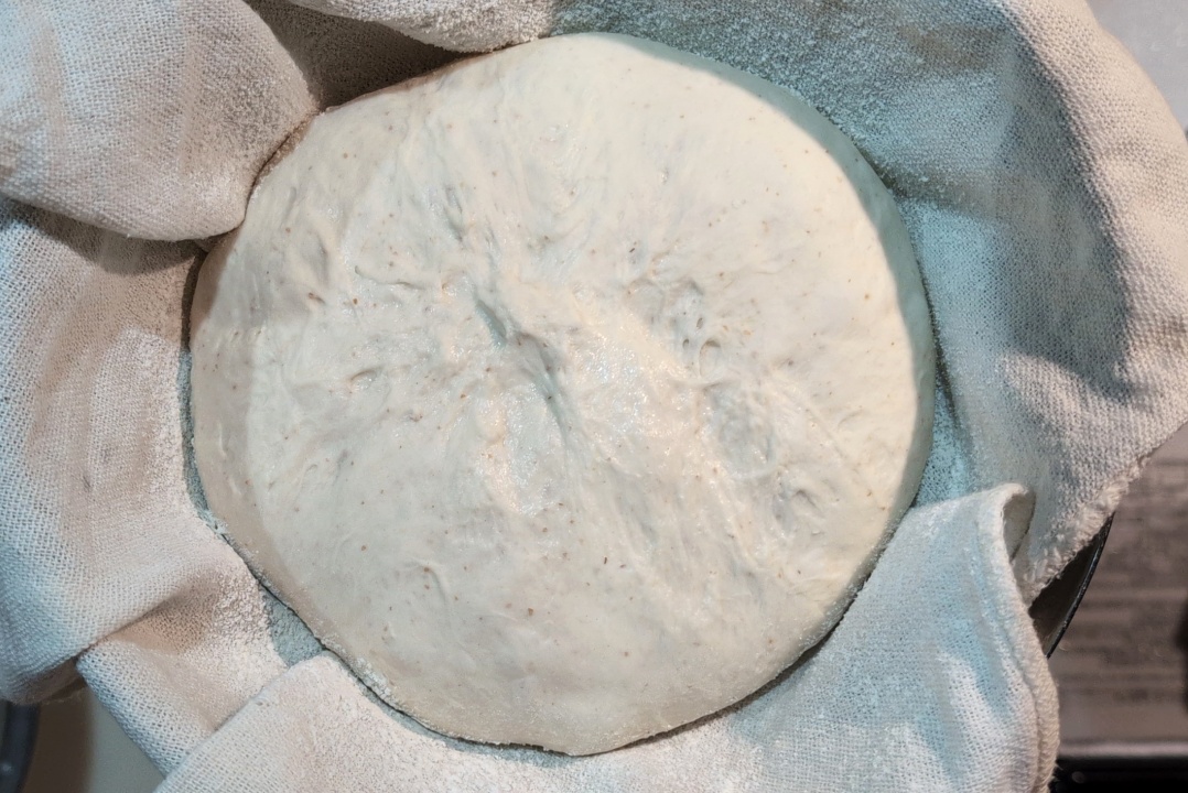 今回パンの型としてボウルを使っていますが、ボウルならもっと生地量を多くしても問題なさそうだったので生地量を増やしています(手持ちの楕円形の発酵かごは入る量がもう少し少ない)。