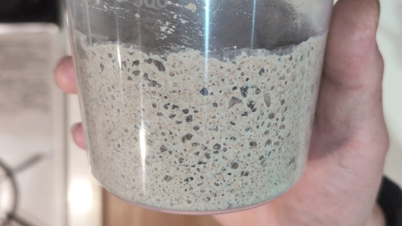 - サワー種の材料を全て計量し、ボウルに入れて混ぜ合わせます。20~22℃で12~16時間熟成させます。