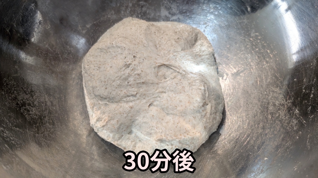 ライ麦粉、小麦全粒粉、米粉はいずれも精製した小麦粉よりも水を吸います。そのため、今回は水の量を75%(少し多めの水分量)にしてみましたが、作業性に問題は無いように感じました。