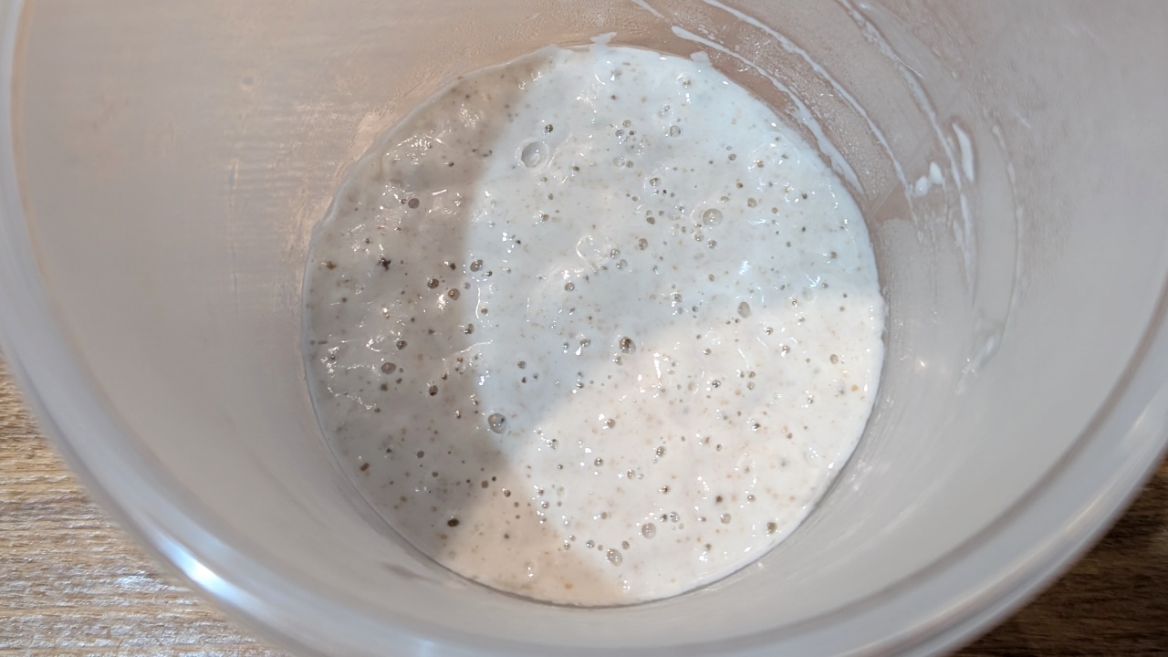 - サワー種の材料を全て計量し、ボウルに入れて混ぜ合わせます。20~22℃で12~16時間熟成させます。