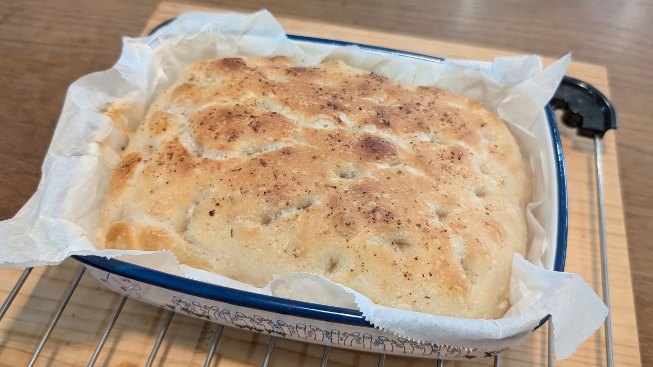 フォカッチャは天板で焼くこともできますし、型を使っても焼けますが、今回はホーロー容器を使った厚みのあるタイプにしてみました。