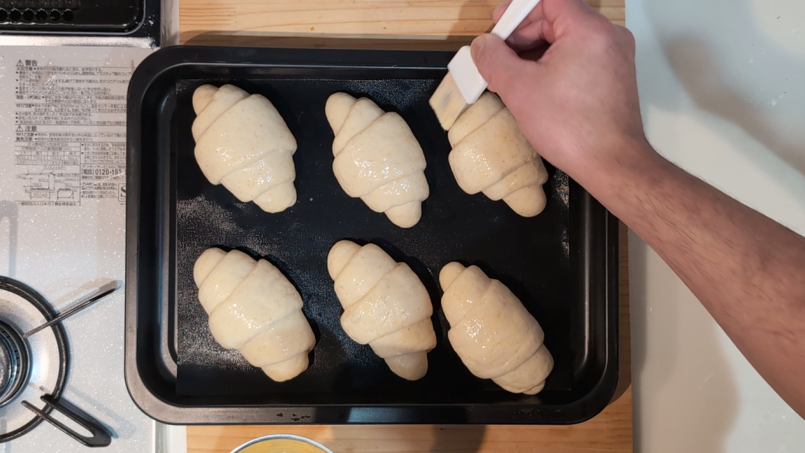 - パンの表面を軽く乾かし、刷毛を使って溶き卵(分量外)をやさしく塗ります。